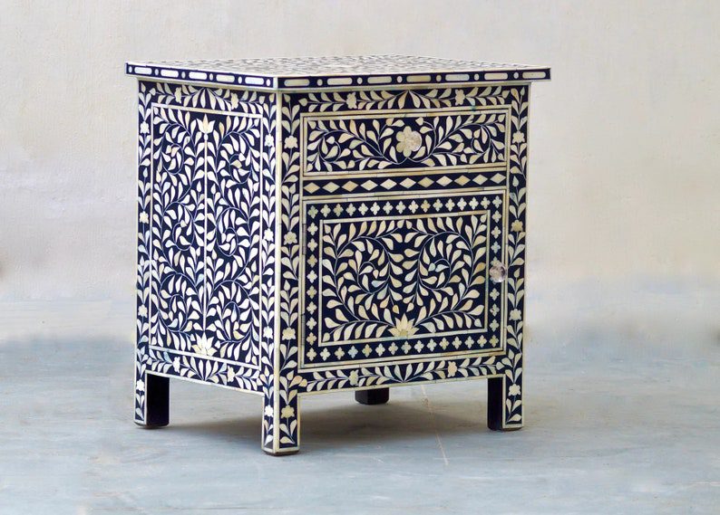 Be the first to review “Bone Inlay 1 Drawer, 1 Door Bedside Table – Navy Floral” Cancel reply