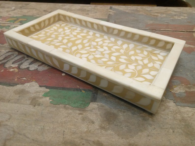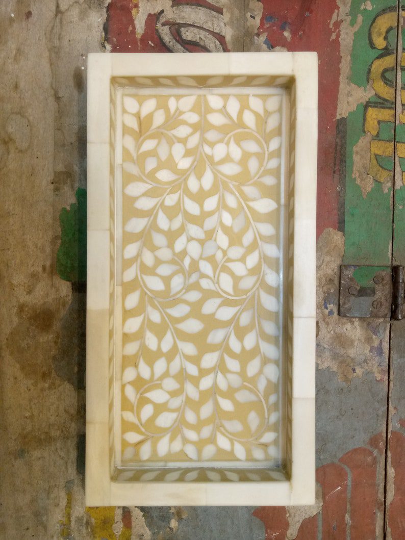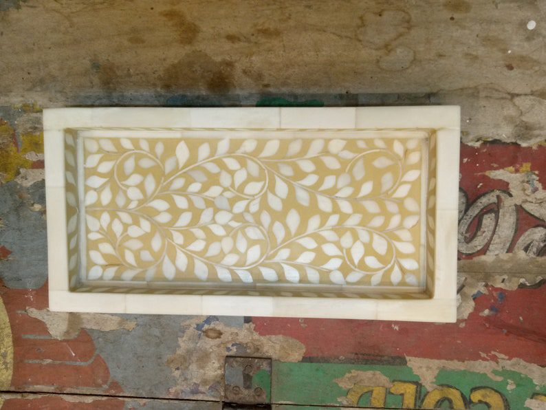A handcrafted bone inlay tray is a beautiful addition to the home decor and store essentials. The tray inlaid with pieces of bone looks elegant. An inlay is a decorative technique that consists of inserting small pieces of bone, mother of pearl into a pattern. The resulting pattern is used on a variety of home décor pieces from dressers to desks to tables and chairs.