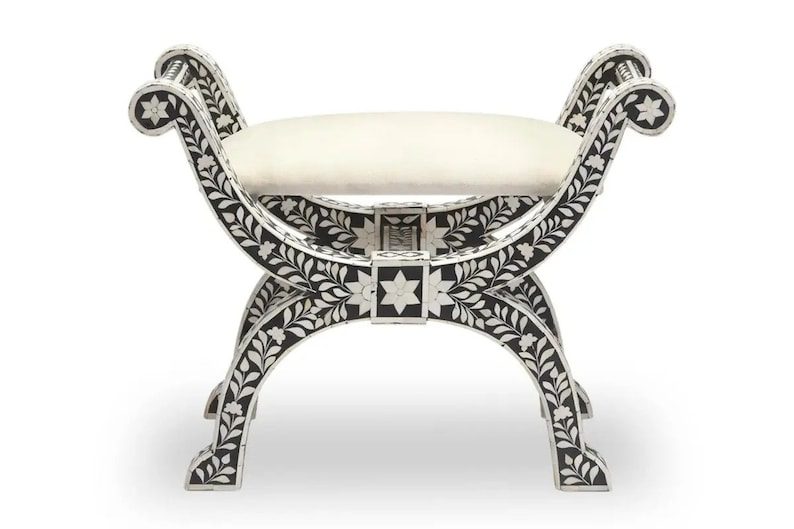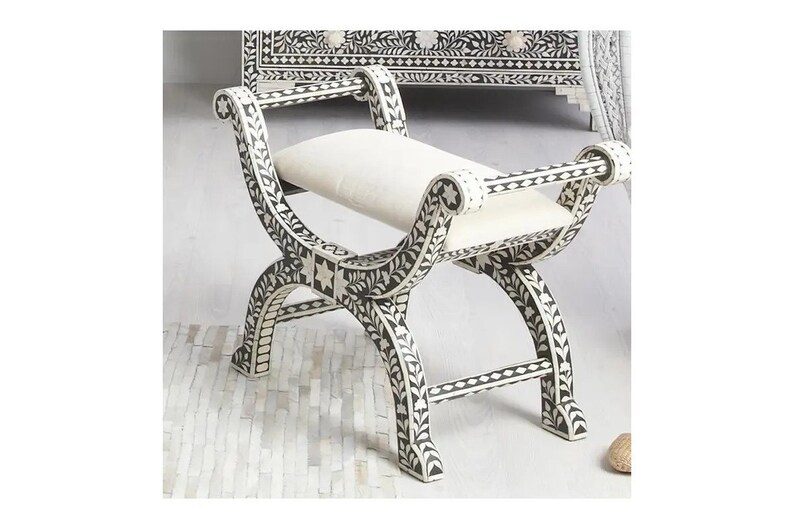 This piece would sit beautifully at the end of your bed next to a dressing table or console or in a bathroom or dressing room. Please note the upholstered cushion is not affixed to the Bone Inlay Frame due to the delicate material of the frame. The seat is sturdy and sits neatly on the frame.
