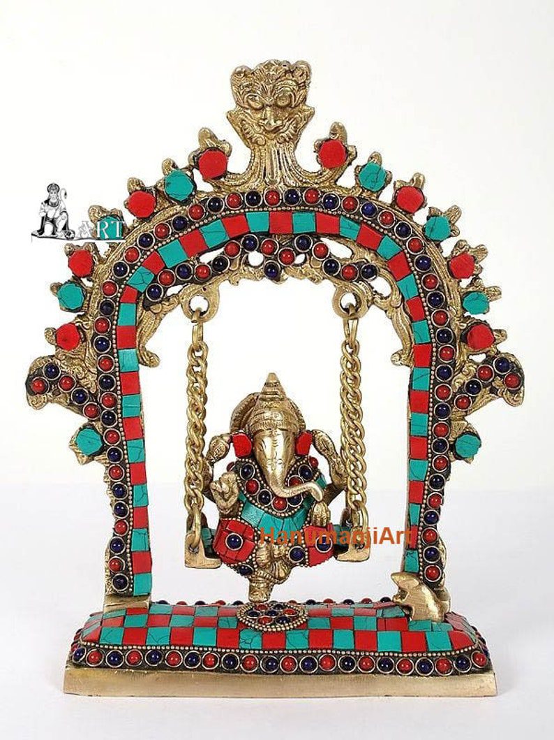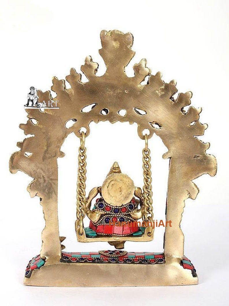 Brass Lord Ganesha on Kirtimukha Swing Inlay Handmade Vintage Home Decor Ganesha
