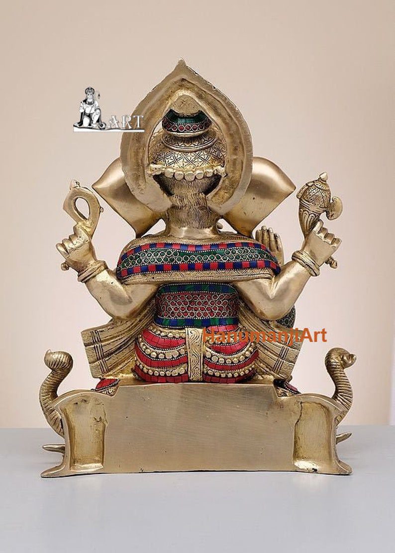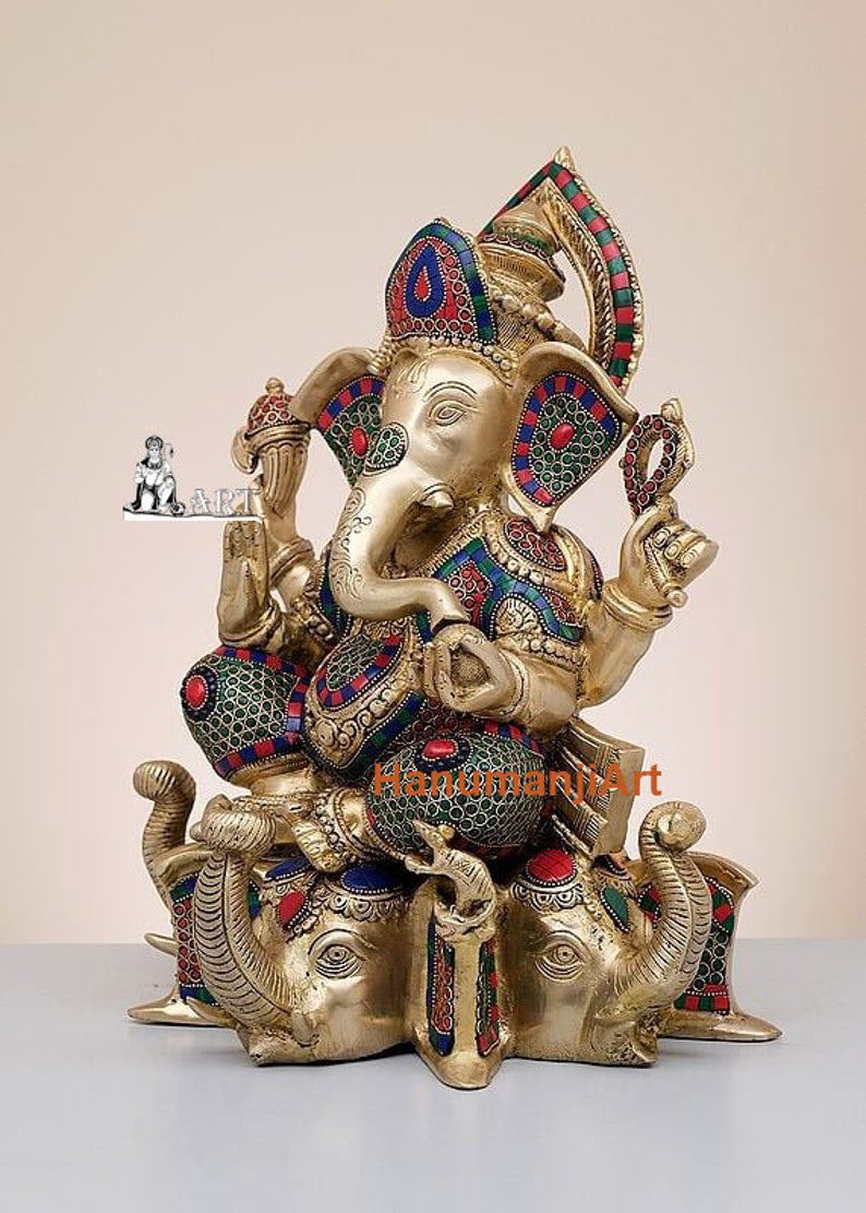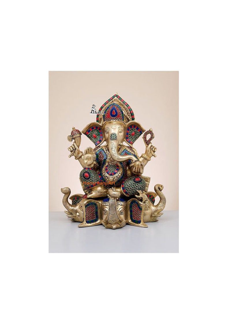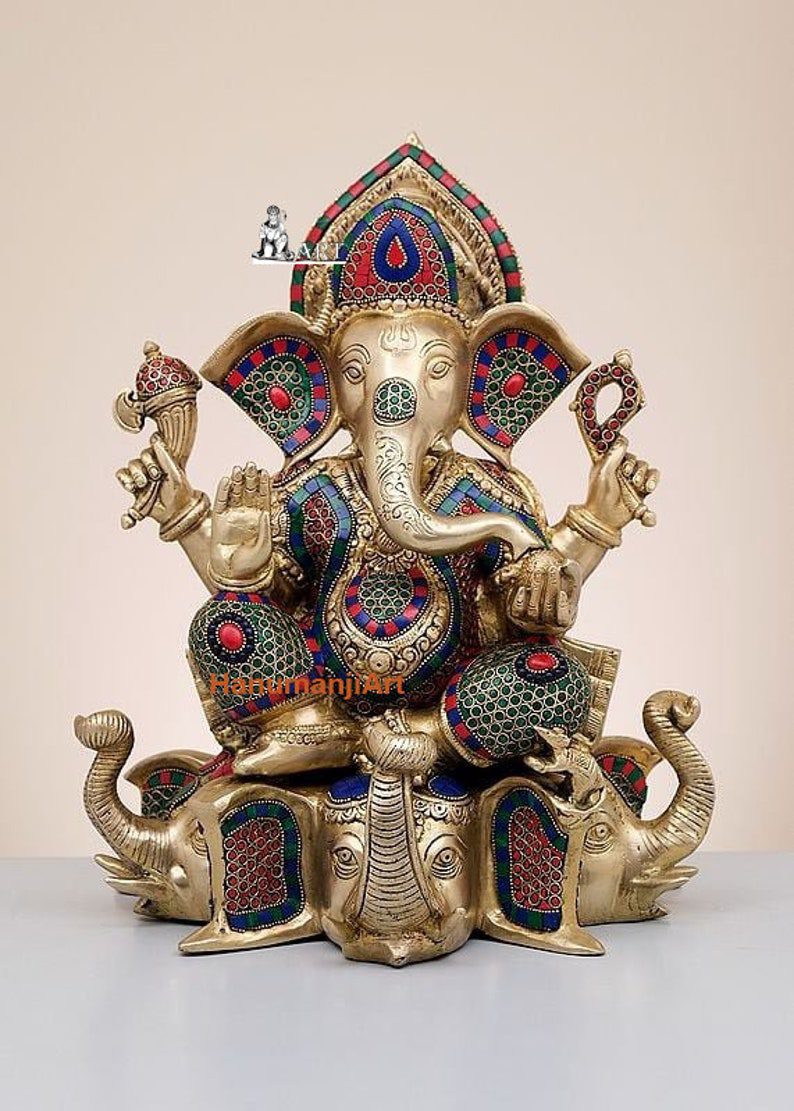 Brass Lord Ganesha Seated on Elephant Pedestal with Inlay Work Handmade