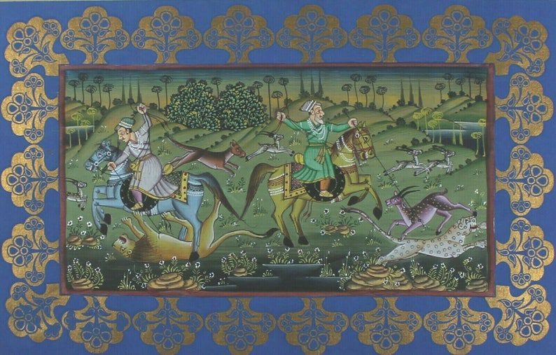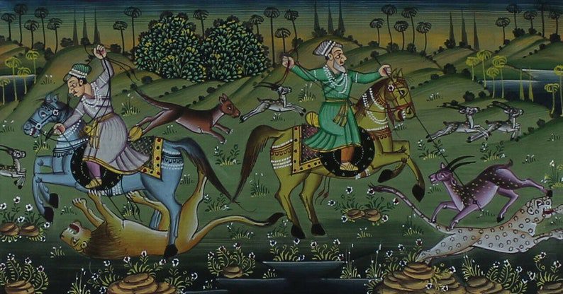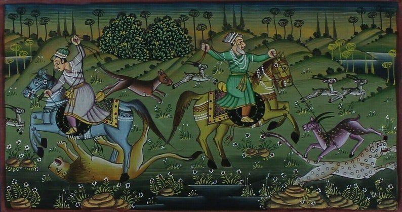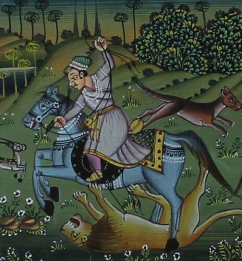 King Hunting Scene Paper Painting Original Handmade Mughal Indian Home Decor Art