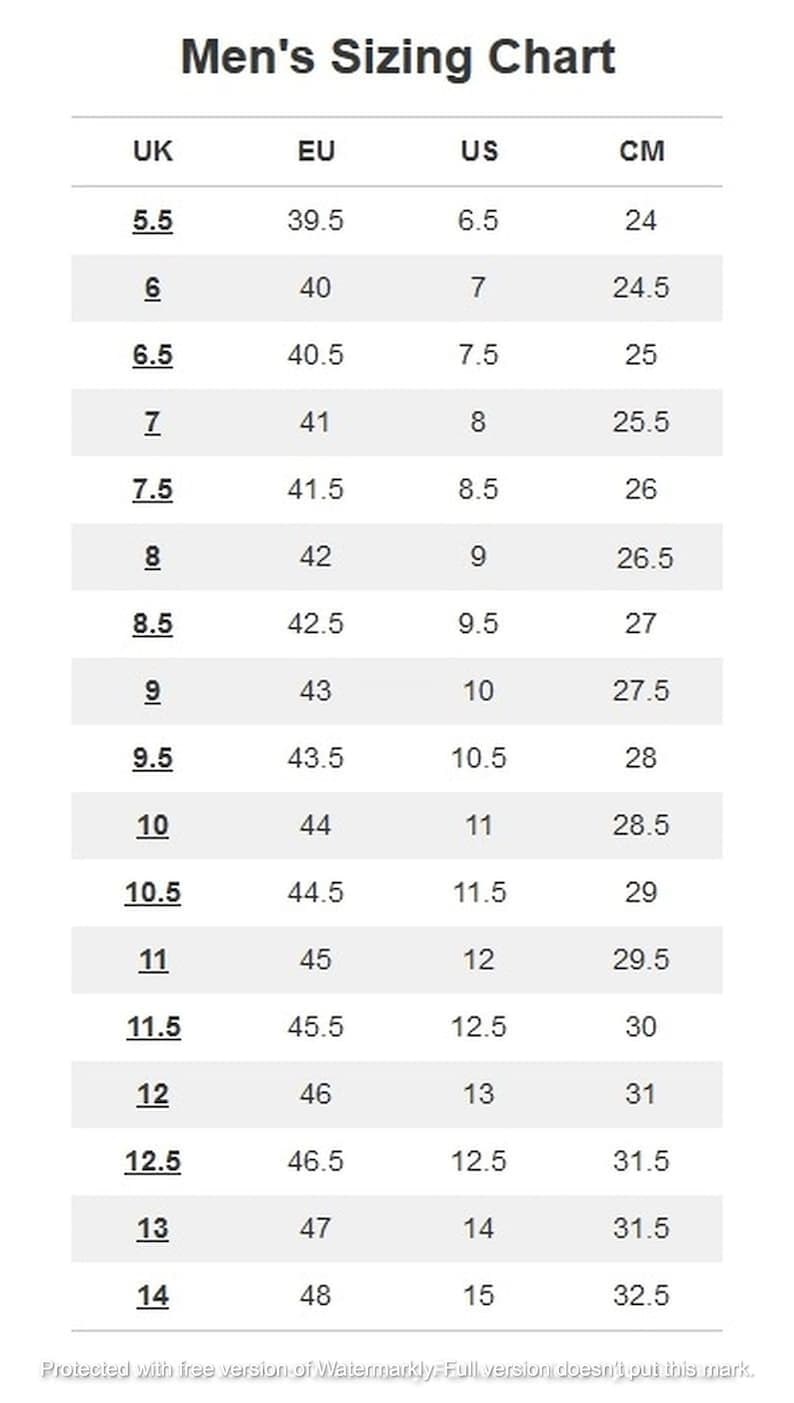 6.5 UK Men's, 7 UK men's, 7.5 UK Men's, 8 UK men's, 8.5 UK Men's, 9 UK men's, 9.5 UK Men's, 10 UK men's, 10.5 UK Men's, 11 UK men's