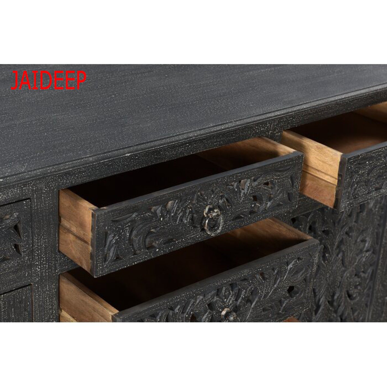 Wowing with artful, carved details and a richly distressed finish, this sideboard provides ample storage space without being short on style. It features six drawers with metal pulls to store tableware and lines and two divided cabinets on each end. Handicrafed with solid mango wood, this sidedboard is durable and made to last