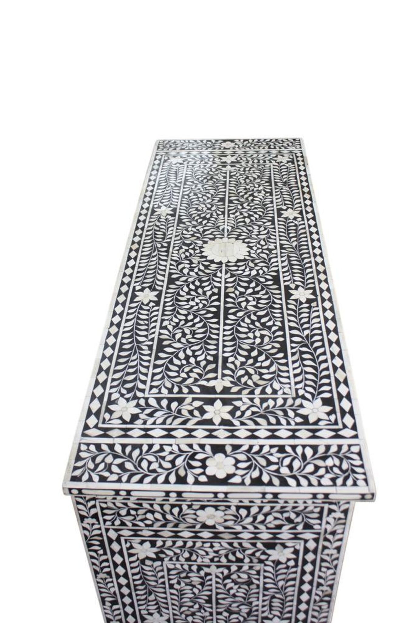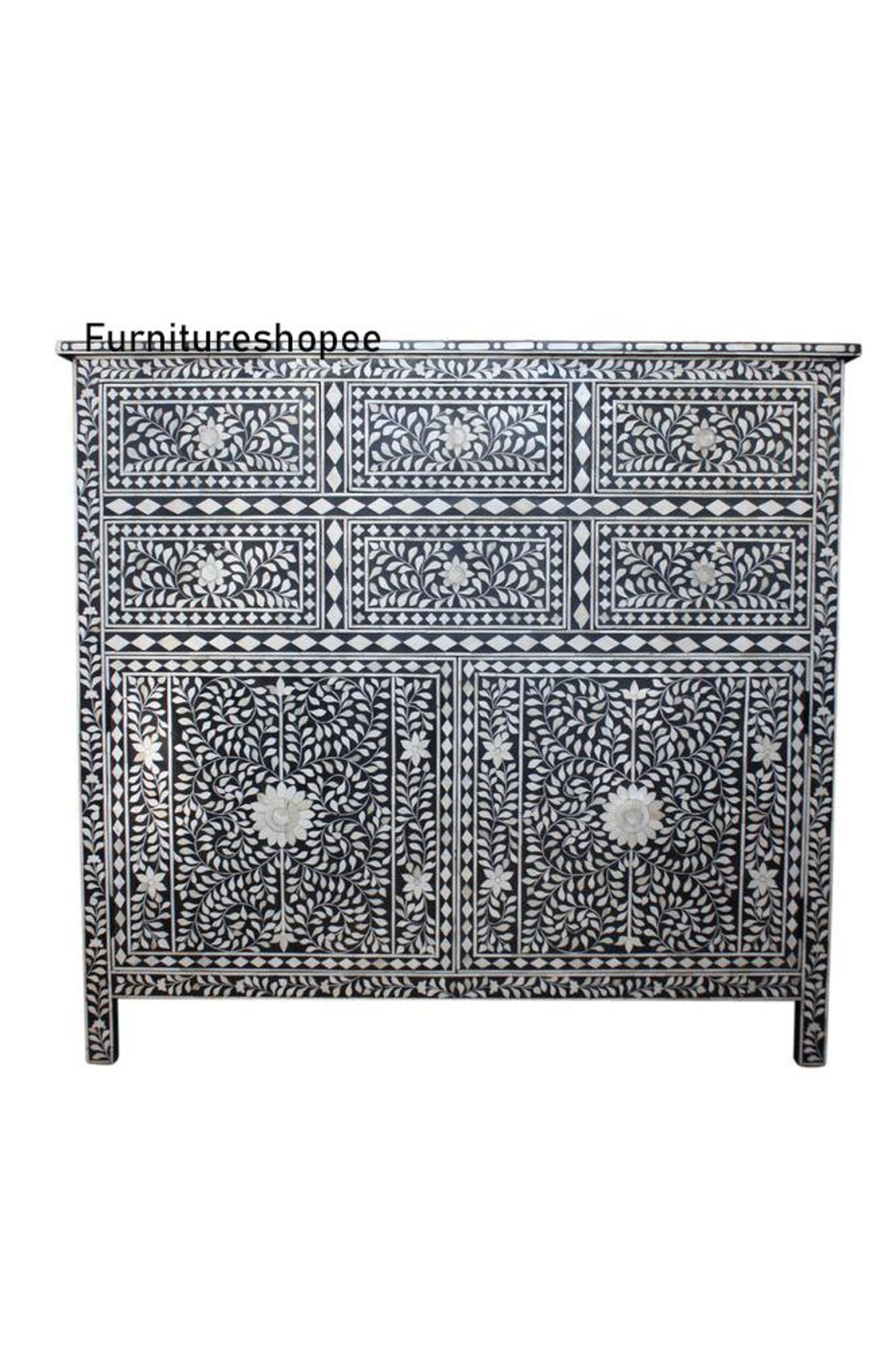 An inspired addition to the Hallway, Entryway, living room, Office, Restaurant this unique Chest is functional modern art. Hand-cut and individually formed, Bone inlays are hand arranged in a transfixing Floral Pattern of Bone Black and White, this bunching Chest is carefully hand crafted from Bone and Wooden/MDF.