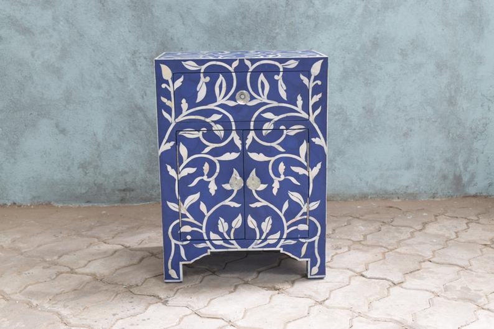 Our Blue Nightstand features 1 Drawer/2 Doors and a beautiful Floral Design, highlighting a simplified and updated indian pattern. This piece of bedside table looks Elegant or stunning due to its beautiful design. This bedside include 1 Drawer/ 2 Doors which give a enchanting look to bedside. Bedside can be used at many steps of our life. This bedside can be used for many purposes like we can use this product for keeping our valuable items in its elegant drawer. Bedside is very easy to carry and make it to go. anywhere bedside give a style to elevate your decor and give charming look.