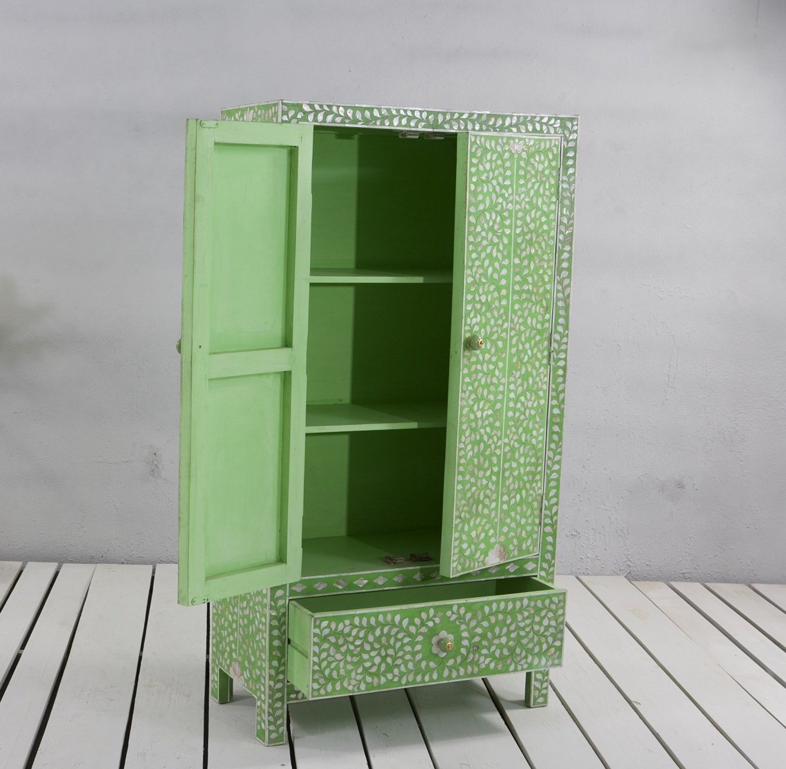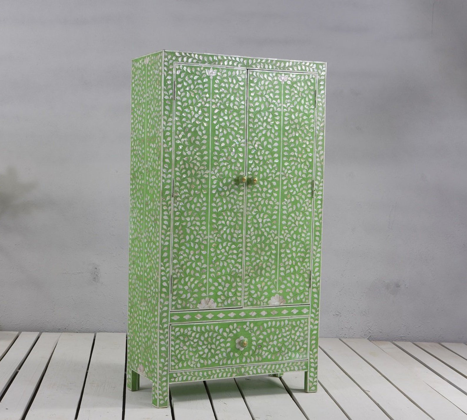 The Mother of pearl Inlay 1 Drawer/2 Doors Wardrobes/Almirah will compliment existing furnishings and add personality to any space. Add a touch of india’s decorative culture to your bedroom with our beautifully designed inlay chest. add a touch of india’s rich decorative culture to your bedroom with our beautifully designed MOP inlay chest. Emphasizing the age-old charm of Rajasthan. each piece is hand crafted using MOP Inlaid into mango wood in a decorastive paisley design. Mix with a neural palette for a contemporary Indian feel, pairing with marble flooring, linen furnishings and textured cushions.