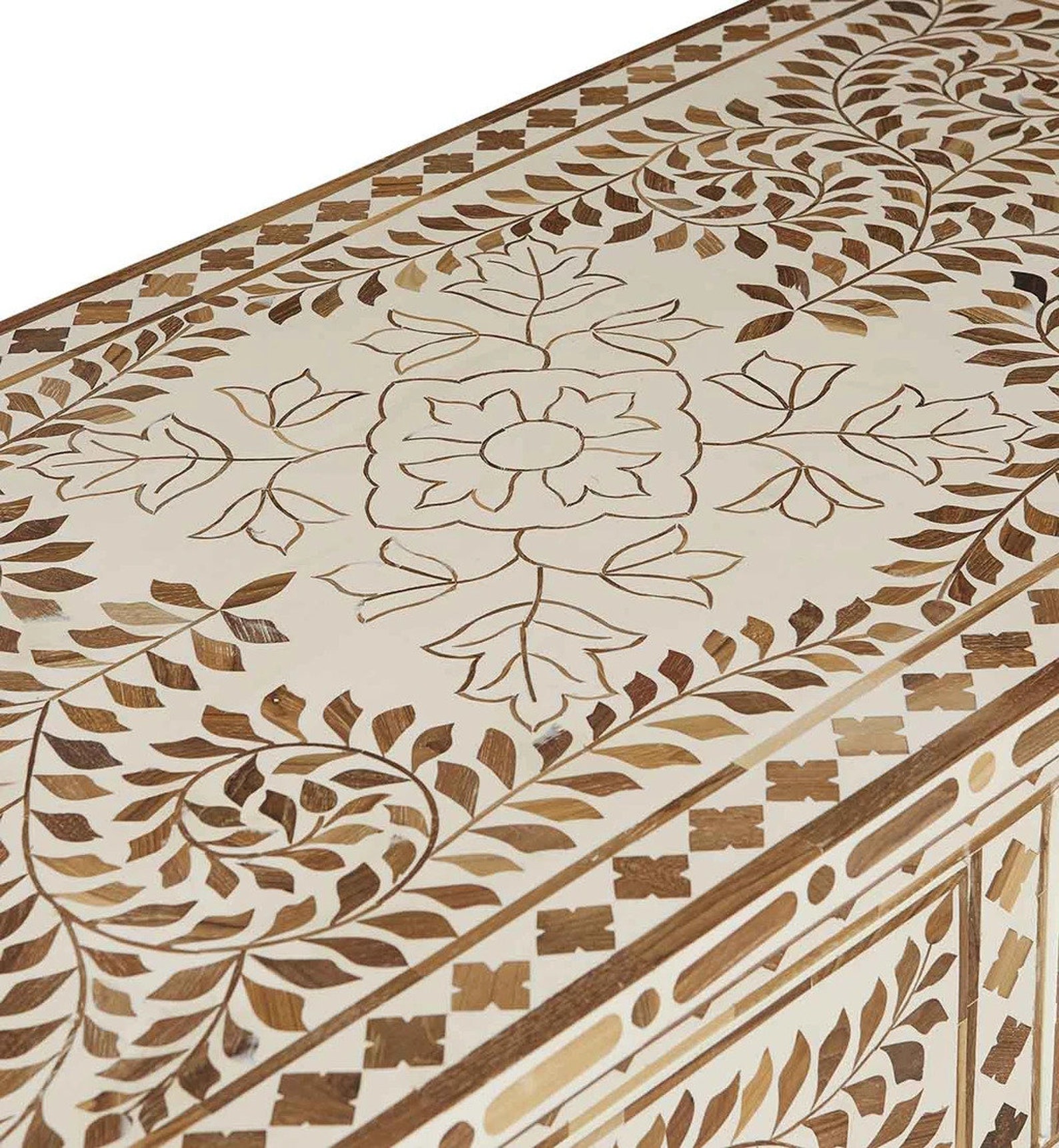 Specifications Colour: White & Natural White Design: Floral Design Material: Bone Inlay, Solid Wood, MDF Dimensions: (L) 100 Cms (D)