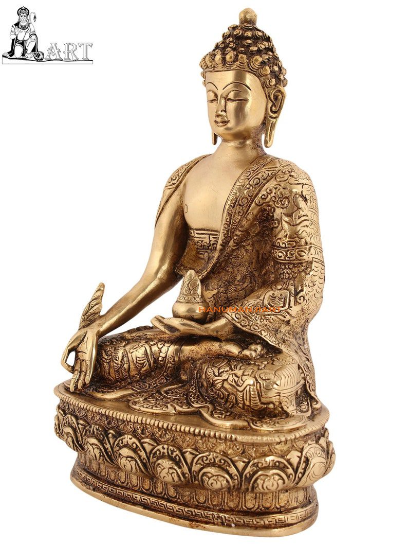 The Bhaishajyaguru Murti That You See On This Page Is A Heavily And Luxuriantly Carved Composition. On A High Plinth He Sits, Roughly A Third Of The Seated Figure’s Stature. The Robe Drawn Over His Princely Shoulders Is Engraved With Episodes From The Life Of Shakyamuni. Beneath The Same Is A Complexion Of Molten Gold Colour.