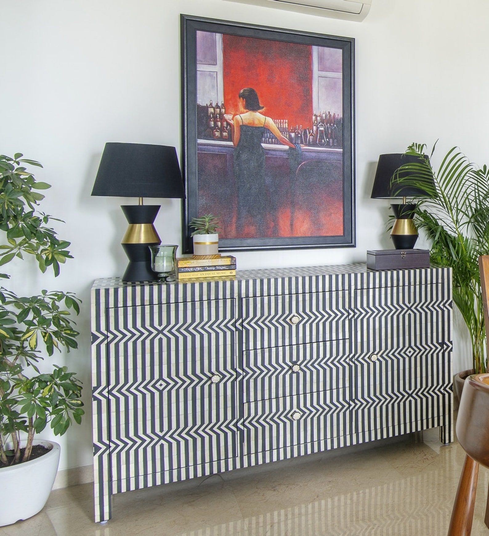 An inspired addition to the Hallway, Entryway, living room, Office, Restaurant this unique Chest is functional modern art. Hand-cut and individually formed, Bone inlays are hand arranged in a transfixing Stripe Pattern of Bone White and Black, this bunching Chest is carefully hand crafted from Bone and Wooden/MDF.
