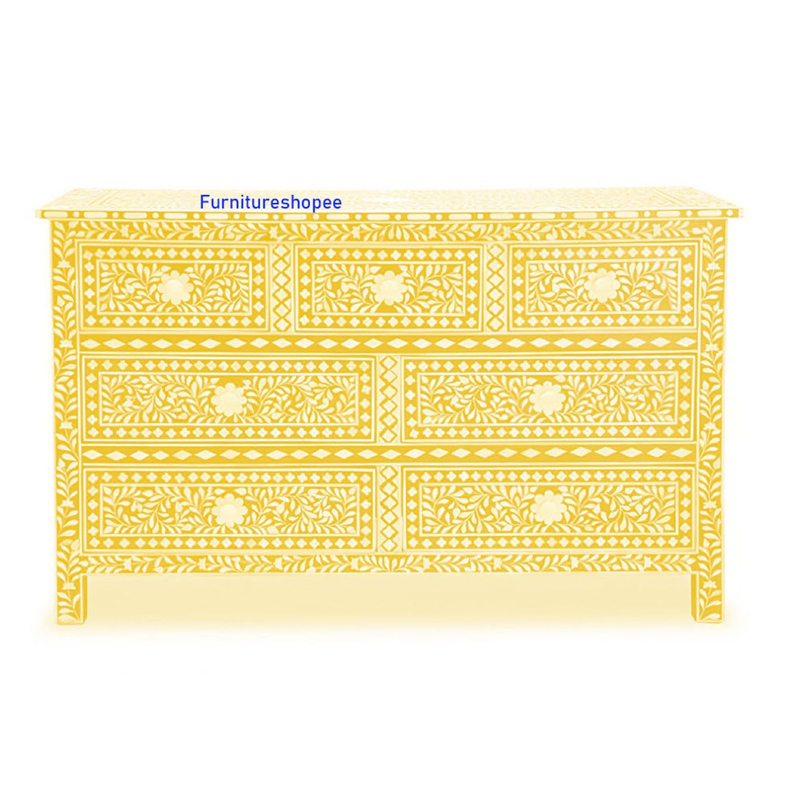 The Bone Inlay 7 Drawer Chest of Drawer will compliment existing furnishings and add personality to any space. Add a touch of india’s decorative culture to your bedroom with our beautifully designed inlay chest. add a touch of india’s rich decorative culture to your bedroom with our beautifully designed Bone inlay chest. Emphasizing the age-old charm of Rajasthan. each piece is hand crafted using Bone Inlaid into mango wood in a decorative paisley design. Mix with a neural palette for a contemporary Indian feel, pairing with marble flooring, linen furnishings and textured cushions.