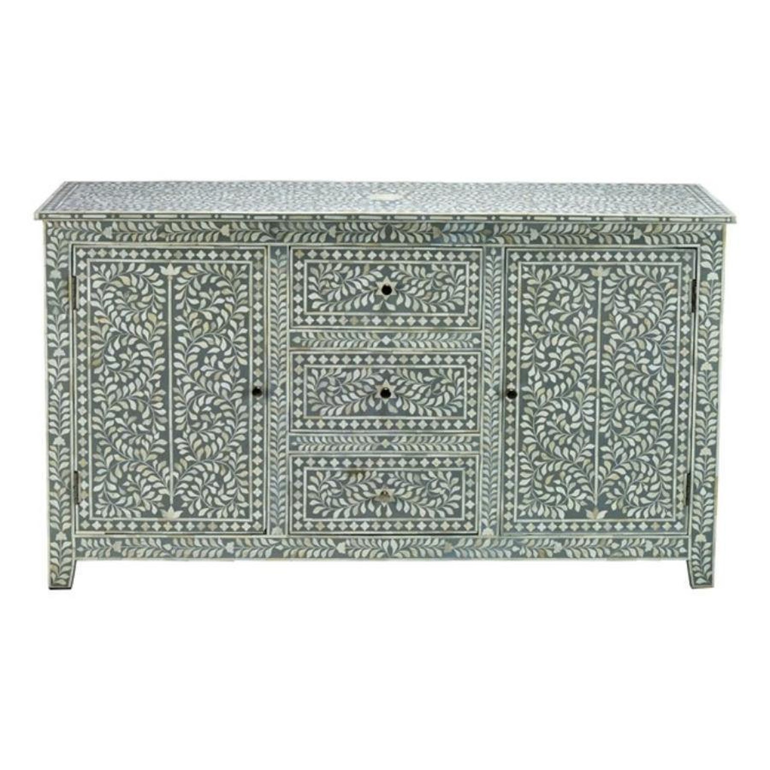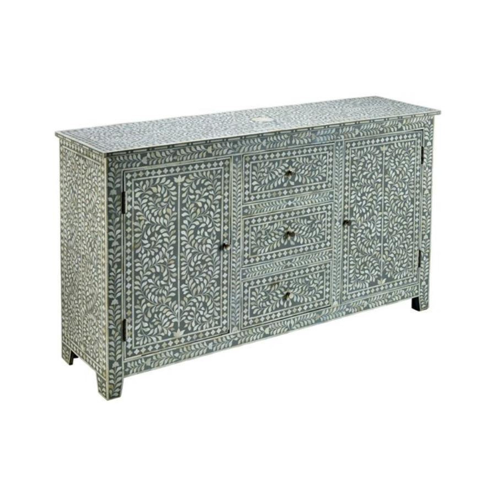 The Bone Inlaly 3 Drawer/ 2 Doors Chest of Drawer will compliment existing furnishings and add personality to any space. Add a touch of india’s decorative culture to your Hallway/bedroom with our beautifully designed inlay chest. add a touch of india’s rich decorative culture to your bedroom with our beautifully designed Bone inlay chest. Emphasizing the age-old charm of Rajasthan. each piece is hand crafted using Bone Inlaid into mango wood in a decorastive paisley design. Mix with a neural palette for a contemporary Indian feel, pairing with marble flooring, linen furnishings and textured cushions.