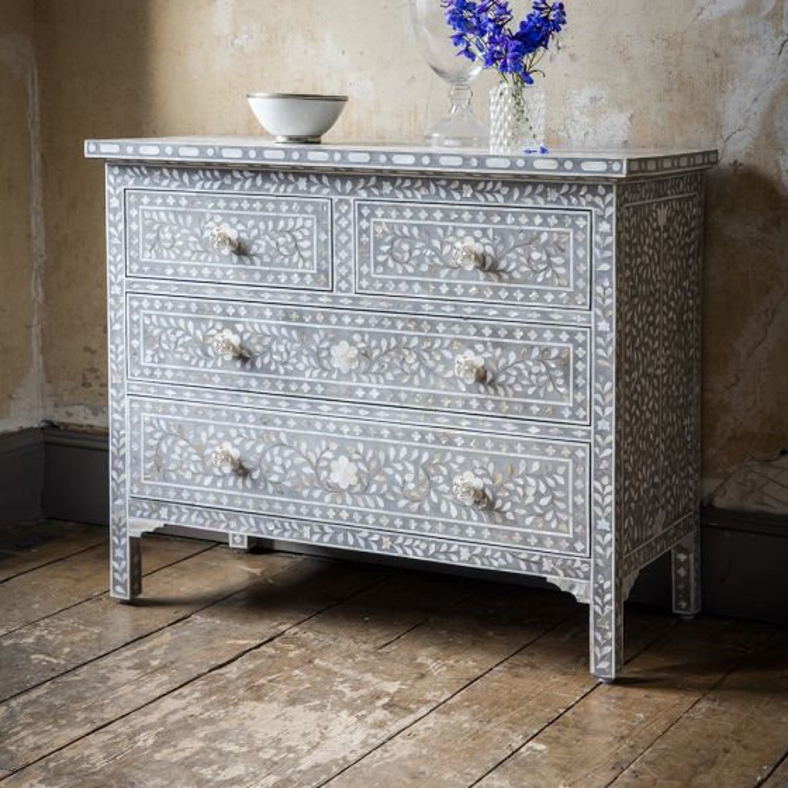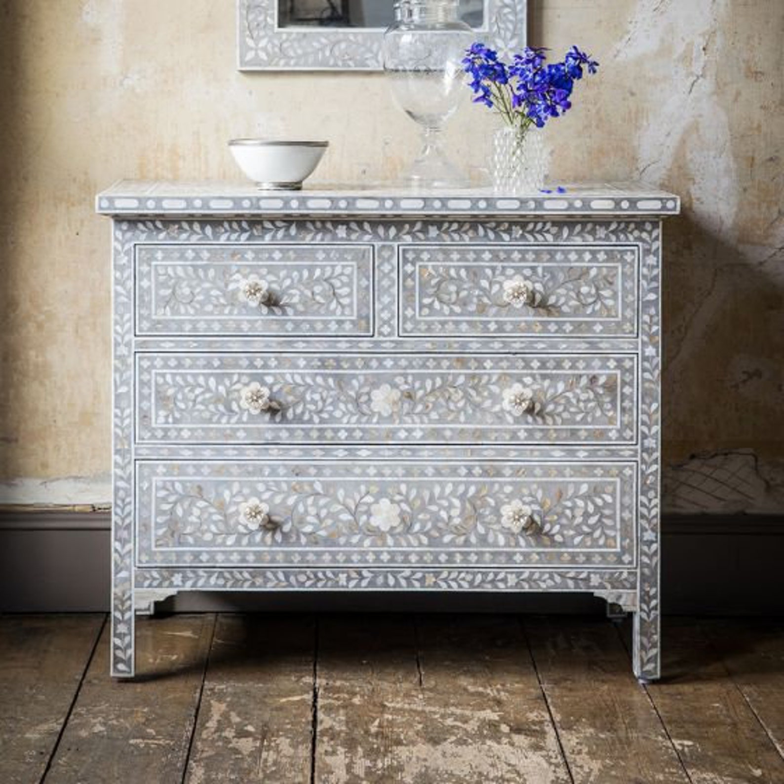 The Mother of pearl Inlay 4 Drawer Chest will compliment existing furnishings and add personality to any space. Add a touch of india’s decorative culture to your bedroom with our beautifully designed inlay chest. add a touch of india’s rich decorative culture to your bedroom with our beautifully designed MOP inlay chest. Emphasizing the age-old charm of Rajasthan. each piece is hand crafted using MOP Inlaid into mango wood in a decorastive paisley design. Mix with a neural palette for a contemporary Indian feel, pairing with marble flooring, linen furnishings and textured cushions.