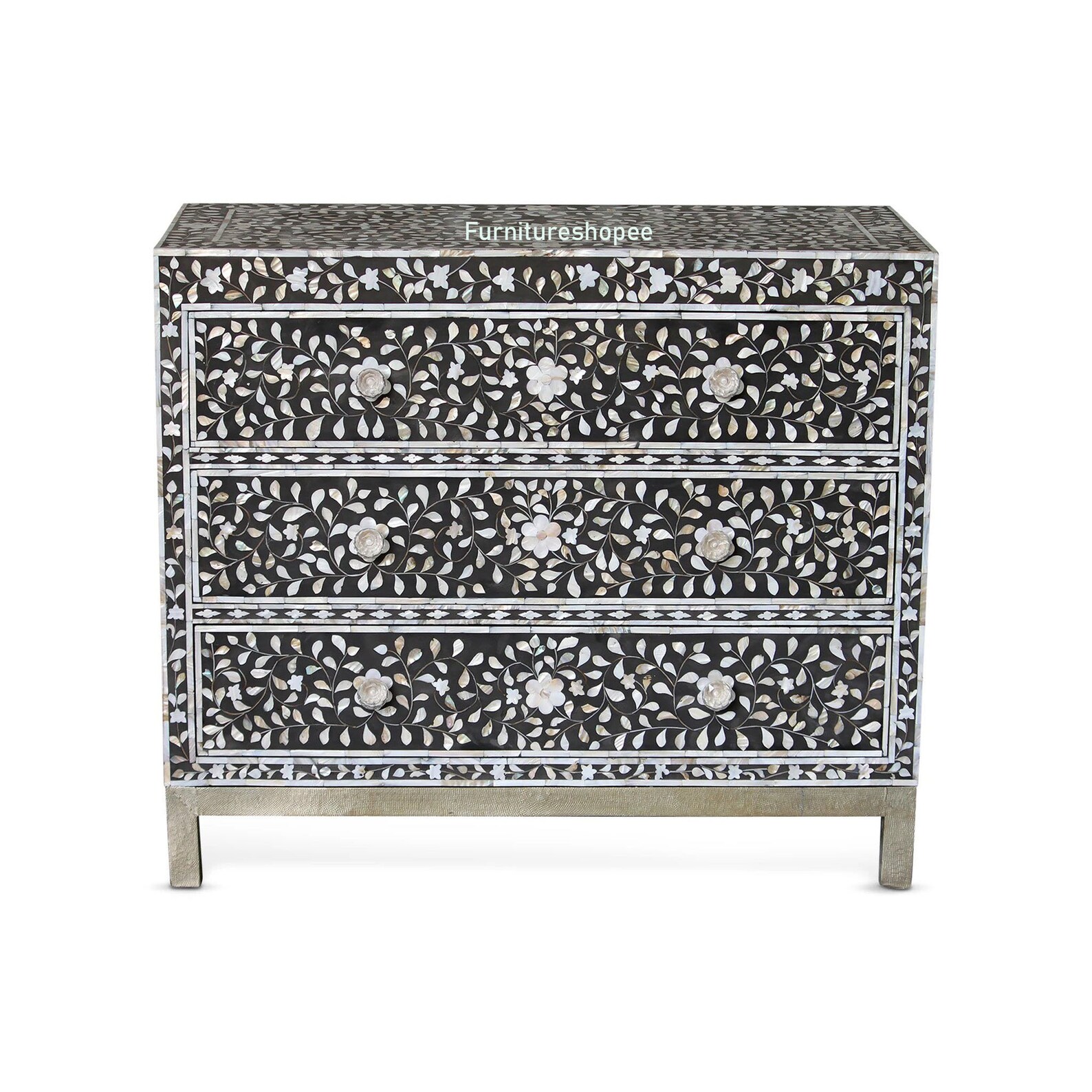 An inspired addition to the Hallway, Entryway, living room, Office, Restaurant this unique Chest is functional modern art. Hand-cut and individually formed, MOP inlays are hand arranged in a transfixing Floral Pattern of MOP and Black, this bunching Chest is carefully hand crafted from MOP and Wooden/MDF.