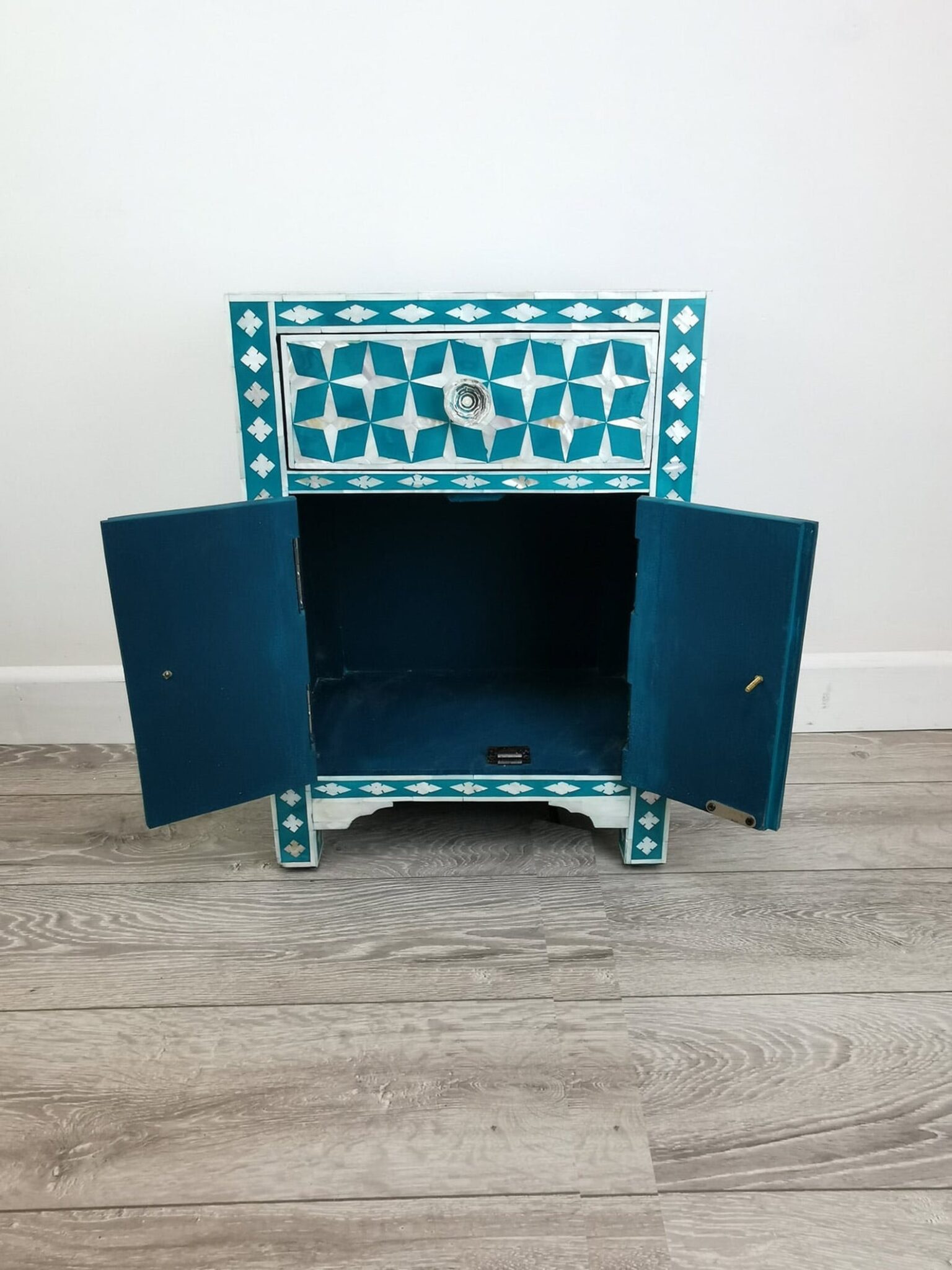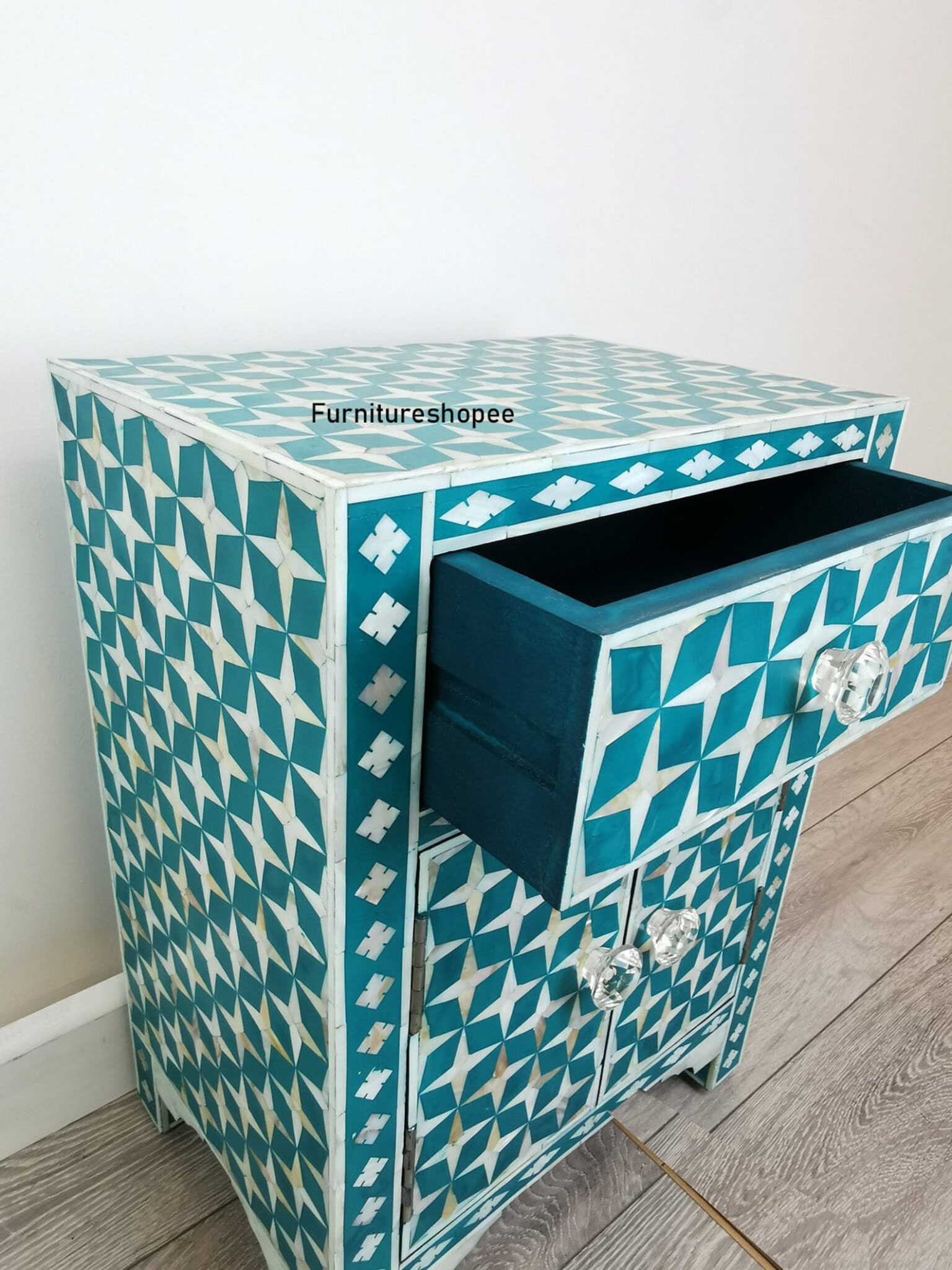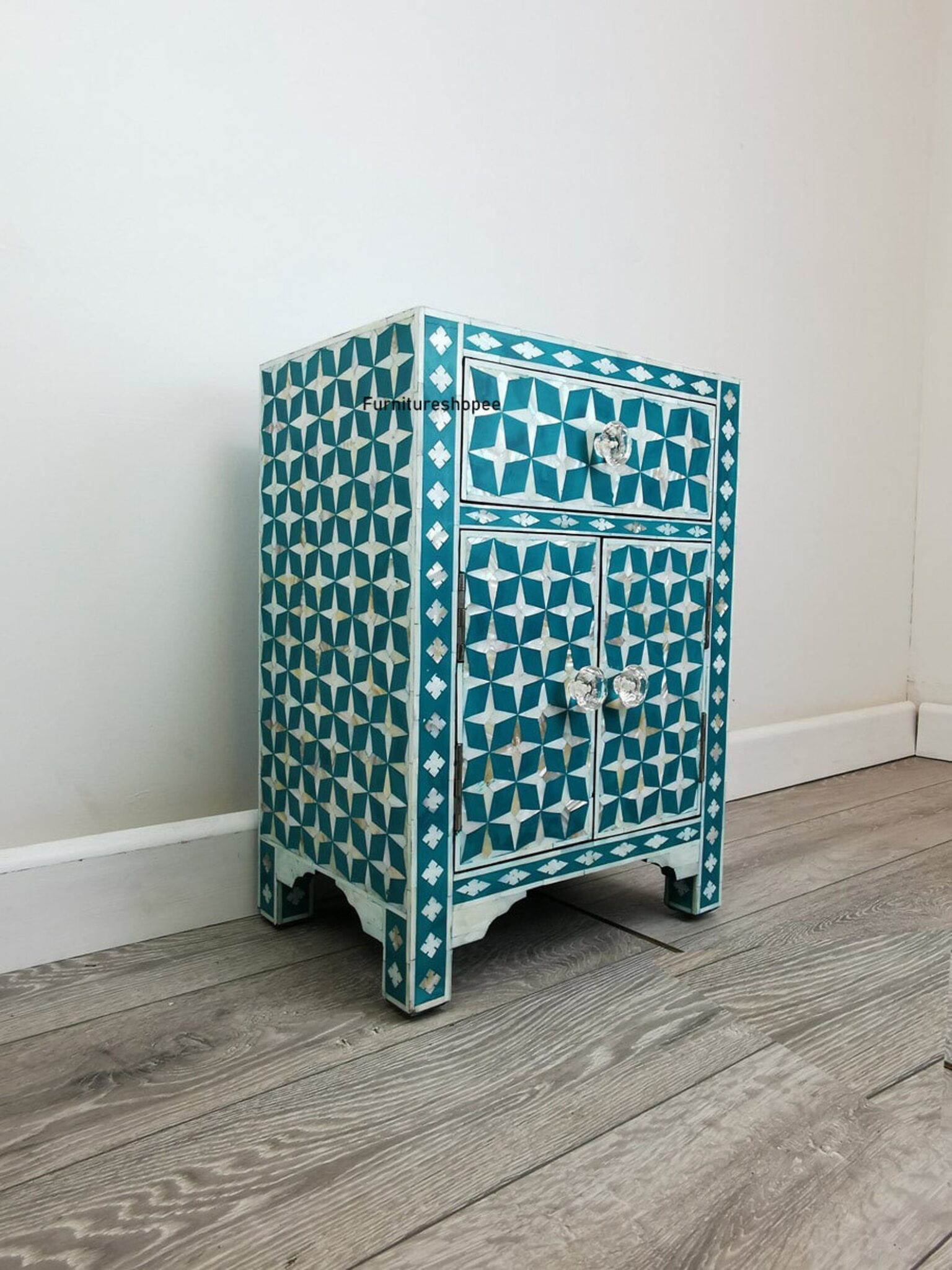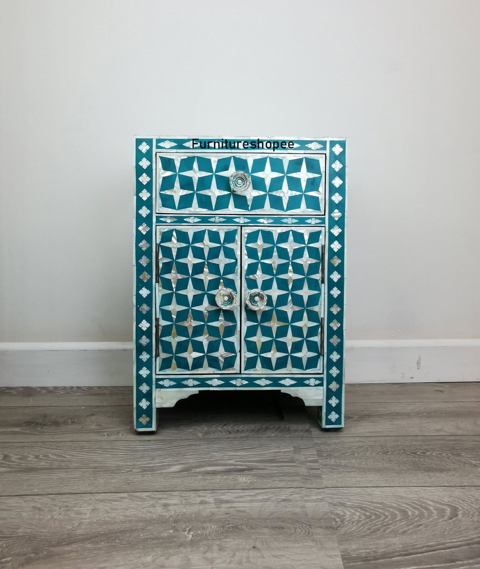Our Mother of pearl Blue Nightstand features 1 Drawer/ 2 Doors and a beautiful Star Design, highlighting a simplified and updated indian pattern. This piece of bedside table looks Elegant or stunning due to its beautiful design. This bedside include 1 Drawer/2 Doors which give a enchanting look to bedside. Bedside can be used at many steps of our life. This bedside can be used for many purposes like we can use this product for keeping our valuable items in its elegant drawer. Bedside is very easy to carry and make it to go. anywhere bedside give a style to elevate your decor and give charming look.