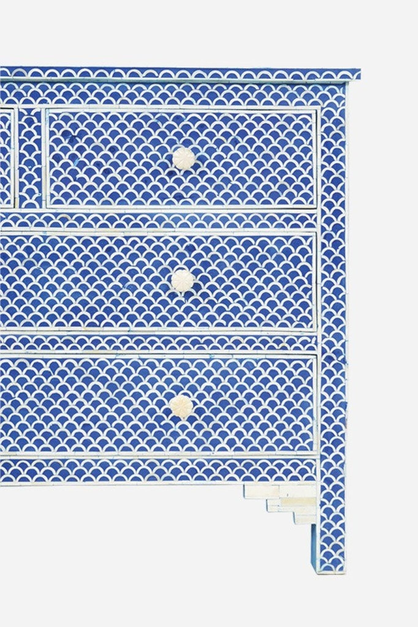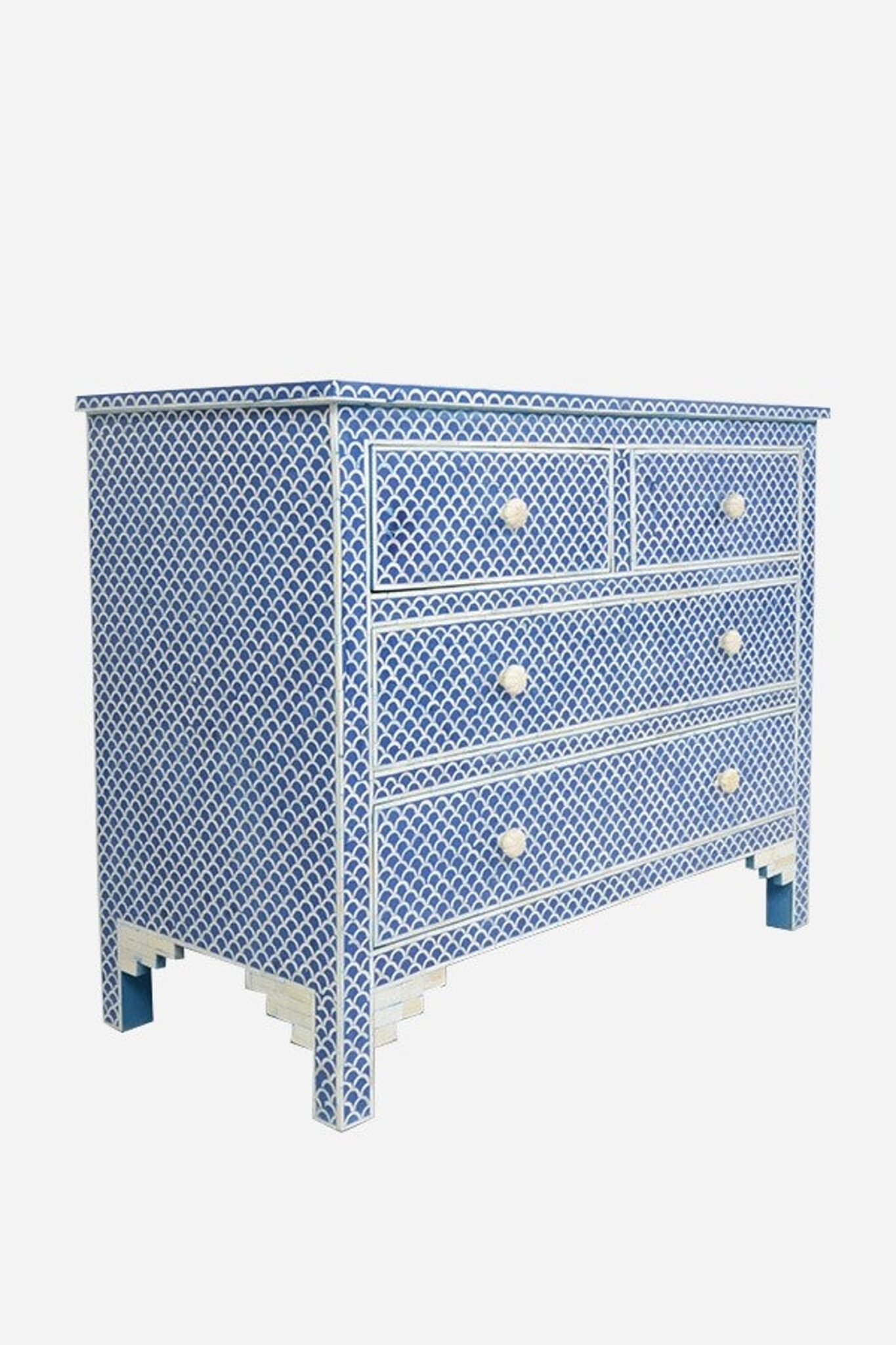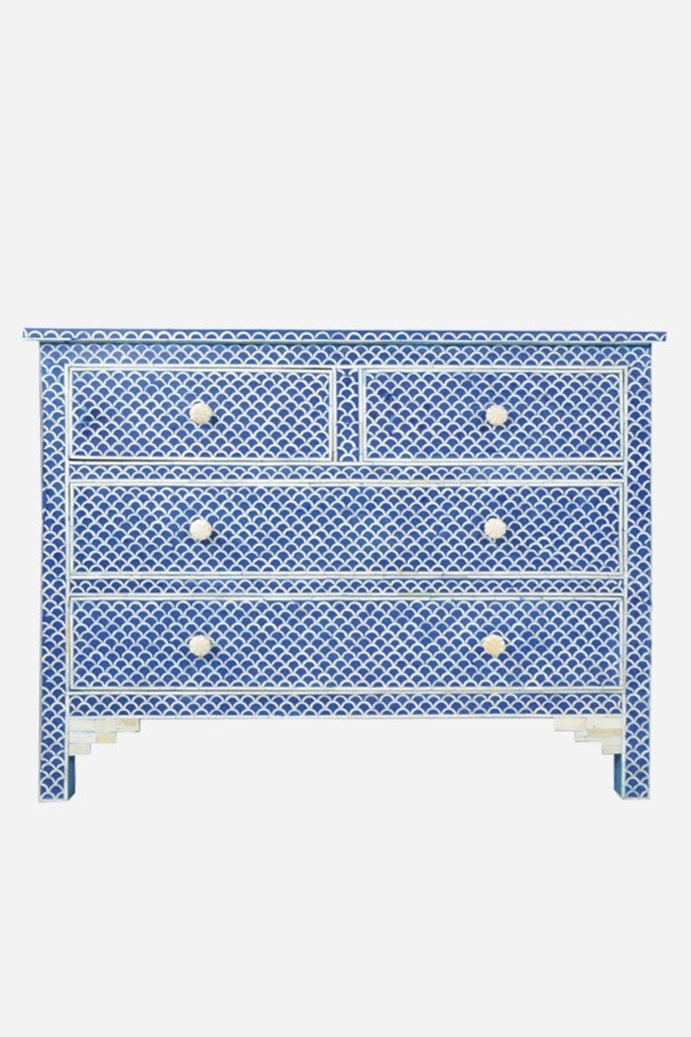 Colour your space with our eye catching cabinet in Blue, with 4 Drawers storage drawers, Bone Inlay drawer pulls and a liped top. made from colured resin that’s mixed and marbled specially for every piece. each bone and Resin tile is individually laid by hand in an intricate Geometric Pattern, before being hand polished to finish. Working with local craftsmen in india, our Fish Scale Designs use traditional techniques that celebrate craftsmanship, each taking hours to construct.