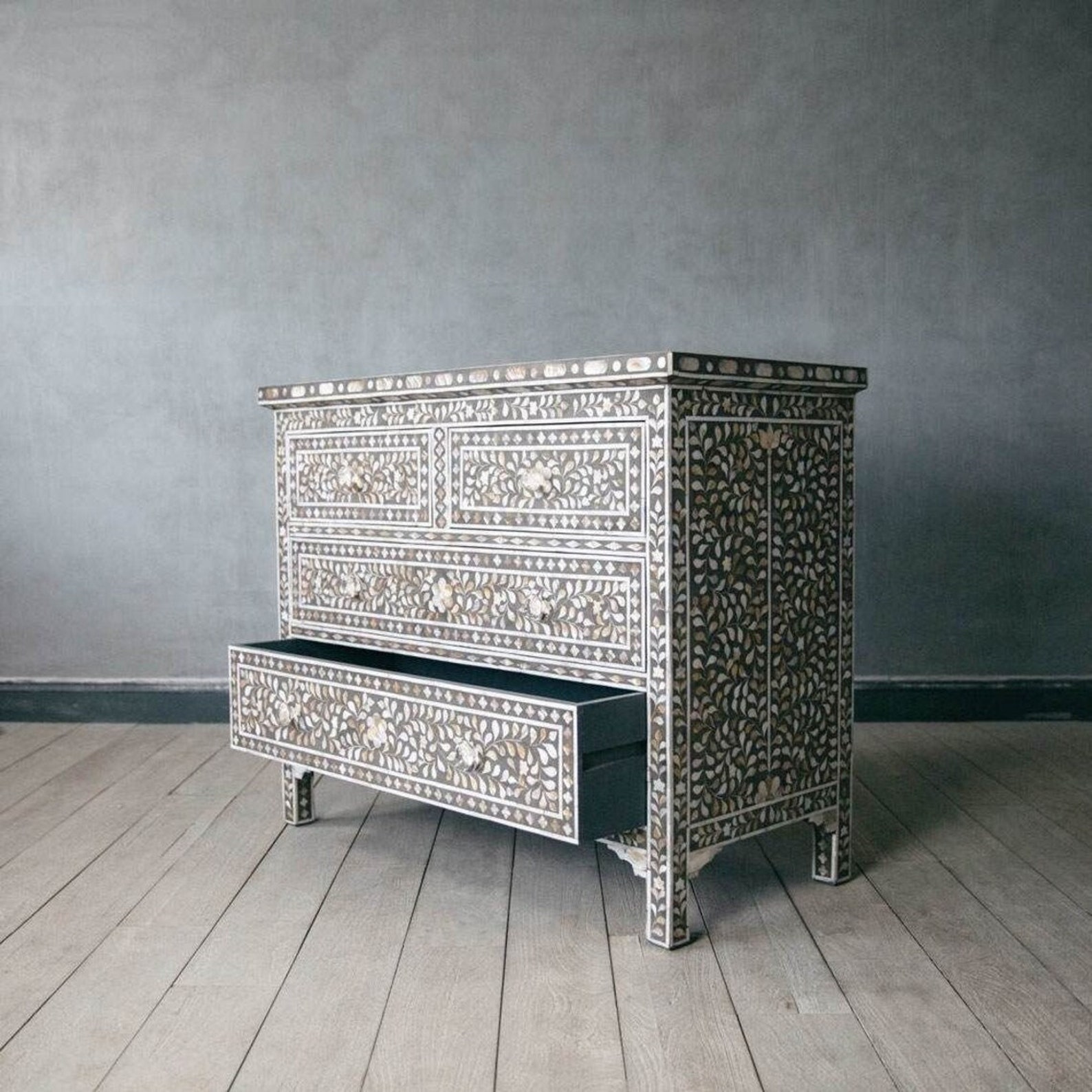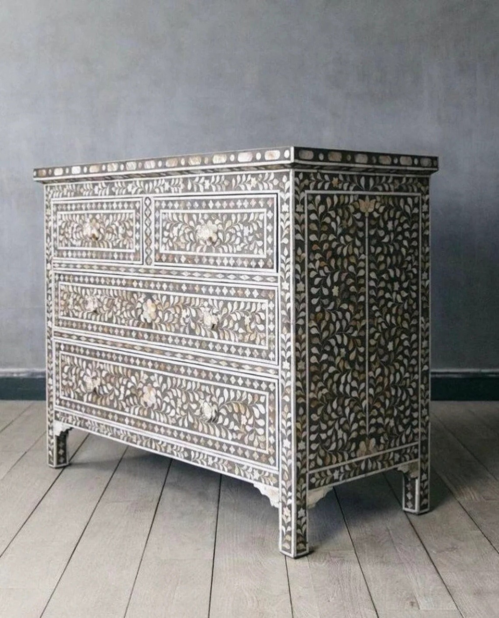 The Mother of pearl Inlay 4 Drawer Sideboard/Chest will compliment existing furnishings and add personality to any space. Add a touch of india’s decorative culture to your bedroom with our beautifully designed inlay chest. add a touch of india’s rich decorative culture to your bedroom with our beautifully designed MOP inlay chest. Emphasizing the age-old charm of Rajasthan. each piece is hand crafted using MOP Inlaid into mango wood in a decorastive paisley design. Mix with a neural palette for a contemporary Indian feel, pairing with marble flooring, linen furnishings and textured cushions.