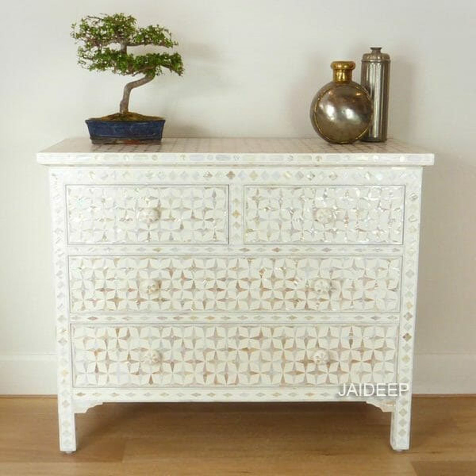 The Mother of pearl Inlay 4 Drawer Chest will compliment existing furnishings and add personality to any space. Add a touch of india’s decorative culture to your bedroom with our beautifully designed inlay chest. add a touch of india’s rich decorative culture to your bedroom with our beautifully designed MOP inlay chest. Emphasizing the age-old charm of Rajasthan. each piece is hand crafted using MOP Inlaid into mango wood in a decorastive paisley design. Mix with a neural palette for a contemporary Indian feel, pairing with marble flooring, linen furnishings and textured cushions.