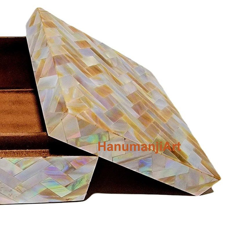 This small elegant jewelry box is a work of art handcrafted by skilled artisans in India Made from a wooden base and intricate Mother of Pearl inlay work this box is perfect for storing your valuable items in style.